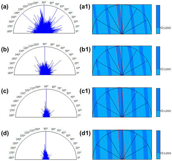 Texture direction representation (based on the Fourier Transform) and texture isotropy representation (based on the autocorrelation function) supported by the AFM topography images, obtained for the phase mask laser, irradiated Az0.25PSS-L (a,a1), Az0.50PSS-L (b,b1), Az0.75PSS-L (c,c1), and Az1.00PSS-L (d,d1). The angles are measured anticlockwise. Same as in texture direction representation, in the texture isotropy representation, the black lines indicates the positions of the main angle lines (0°, 30°, 60°, 90°, 120°, 150°, 180°), the dotted orange lines indicates the positions of the intermediary angle lines and the red lines delimits the periodic motif.