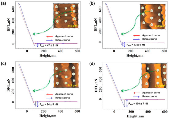 Once this calibration was conducted, force curves were collected using a scan size with the side of 2 μm for Az0.25PSS-L (Figure 6a), Az0.50PSS-L (Figure 6b), Az0.75PSS-L (Figure 6c), and Az1.00PSS-L (Figure 6d), in the places indicated by the asterisk symbol (*). As seen in this Figure 6, the force curves were taken both in the exposed and unexposed regions through the phase mask. According to our previous study [42], where the nanomechanical measurements were made on a Park NX10 Atomic Force Microscope, using PinPoint Nanomechanical mode, with a very good resolution, the value of the adhesion force measured on the top hill (regions covered by the phase mask, unexposed to the laser beam), and bottom valley and base line of the SRGs (regions uncovered by the phase mask, exposed to the laser beam) does not show significant variations. That is why the locations indicated by asterisks were chosen. Only representative force curves were presented in Figure 6. From the retract curves, the average adhesion force (Fadh) was calculated for each sample as the highest extraction force at the final contact position preliminary to the leap of the tip from contact with the surface of the specimen.