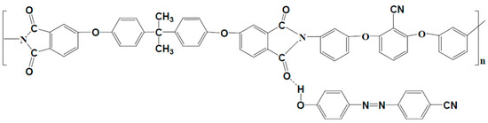 The polyimide supramolecular systems were realized by introducing the 4-[(4-cyanophenyl)diazenyl]phenol in different molar ratios into the solution of polyamidic acid obtained by polycondensation reaction of 2,6-bis(3-aminophenoxy) benzonitrile and 4,4′-isopropylidene-diphenoxy-bis(phthalic anhydride) in equimolar quantities. The molar ratio between the azochromophore and the polyamidic acid was 0.25:1, 0.5:1, 0.75:1, and. 1:1, resulting after casting onto glass plates and thermal treatment (50 °C for 4 h, 100 °C for 1 h, 125 °C for 1 h, 150 °C for 1 h, 175 °C for 1 h, and 200 °C for 1 h) the following azo polyimide supramolecular systems Az0.25PSS, Az0.50PSS, Az0.75PSS, and Az1.00PSS, respectively, in the form of flexible films. The steeping thermal treatment (called thermal imidization process) was mandatory to realize the stable final structure of polyimide [45]. Otherwise, the supramolecular polyimide system is no longer formed, remaining at the azodye/polyamidic acid stage. The synthesis and complete characterization of these compounds was previously reported in [46]. The final chemical structure of the polyimide supramolecular system is presented in Scheme 1: