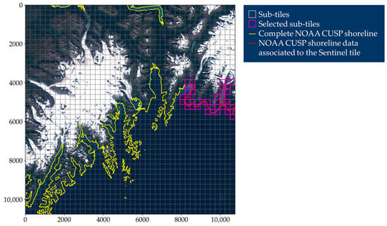 Example of Sentinel-2 Level-1C tile (true color image) split into sub-tiles of size . Only sub-tiles containing shoreline based on measurements performed in dates within 30 days from the Sentinel tile’s acquisition date are analyzed.