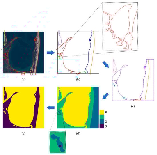 Steps for generating the binary segmentation mask for a sample of the dataset. (a) Selection of the shoreline paths inside the sub-tile. Paths with dates compatible with the Sentinel-2 tile’s date are depicted in red and the other paths in yellow. (b) Merging of contacting paths. Distinct merged paths are depicted using different colors, while the sub-tile border is in black. (c) Clipping of merged paths using the sub-tile border as the clipping window. After this stage, closed polygons are obtained. (d) Starting from a zero-filled matrix of the sub-tile, ones are added in the regions defined by the polygons. (e) A binary map is obtained by classifying the pixels of matrix (d) into even and odds.