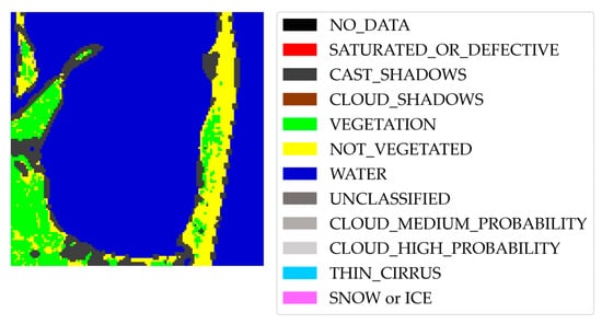Sentinel-2 Level-2A scene classification (SC) mask of the sub-tile in Figure 3. For the sake of clarity, the legend includes all the 12 classes provided by Level-2A SC, although only some of them are identified in this case.