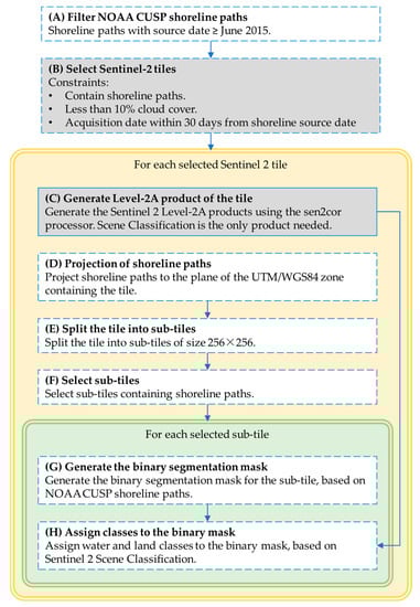 For the sake of clarity, a flowchart of the previously described dataset generation method is depicted in Figure 5. The proposed method is an original solution, and each step except one (marked with a solid line) has been designed and implemented purposely for this work. The flowchart highlights the novelty of this method compared to others reported in the literature and reviewed in Section 2. In these works, sea/land labeling is fundamentally based on the human interpretation of satellite imagery, while the proposed method uses shoreline measurements from NOAA CUSP as a source for automatic labeling.