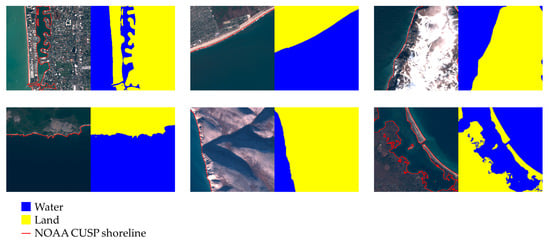 - Aghdami-Nia, M.; Shah-Hosseini, R.; Rostami, A.; Homayouni, S. Automatic Coastline Extraction through Enhanced Sea-Land Segmentation by Modifying Standard U-Net. Int. J. Appl. Earth Obs. Geoinf. 2022, 109, 102785. [Google Scholar] [CrossRef]
