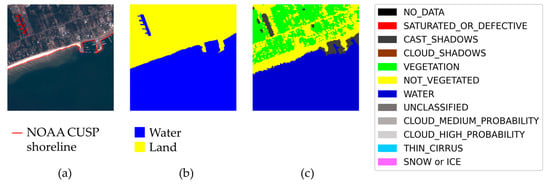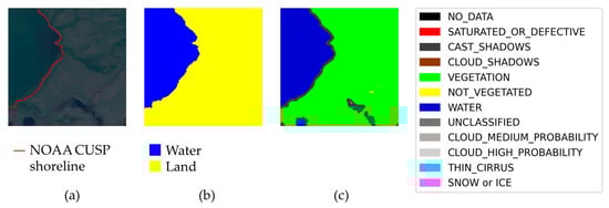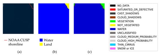 Example of a “suspect” sample, with a possibly incomplete label. There is a region that is water according to Sentinel-2 scene interpretation. The main shoreline in the sample is labeled. (a) True color image. (b) Sea/land segmentation. (c) Sentinel-2 Level-2A scene classification.