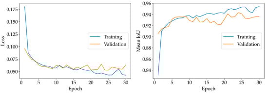 The training process is depicted in Figure 10. The final mean IoU for the validation set, obtained after completing the training phase, is 0.936. In Figure 11, the sea/land segmentation masks produced by the trained U-Net model for the first four samples of the validation set are depicted. The visual inspection of these results shows that an accurate sea/water segmentation is obtained, even if we used the standard U-Net model without any further optimization.