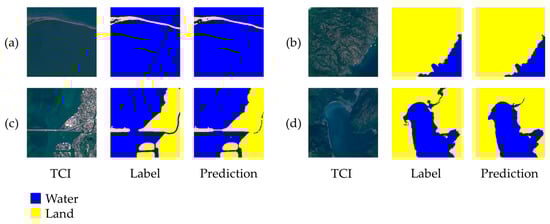 (a–d) Sea/land segmentation results obtained with the trained U-Net model for the first four samples of the validation set.