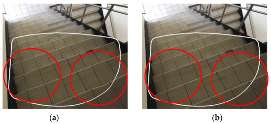 Diagrammatic sketches of the imaging deformation of the stairs at close range using multifocal glasses: (a) defective glasses, (b) normal glasses. (The range of the white frame is the field of view of the eyes wearing glasses, and the range of the red circle is the place where the imaging area is deformed).