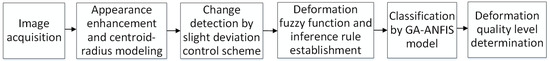 This study presents an optical inspection system with familiar norm patterns of image capture and employs a slight deviation control scheme to check for deformation defects, and a mixed intelligent model incorporating a genetic algorithm and a network-based fuzzy inference system to decide the grade of deformation severity of the multifocal glasses. To measure the grade of deformation of a multifocal glass, we first digitally imaged a pattern of concentric circles through a test glass to generate an imaged image of the glass deformation. This deformation image is examined to investigate the deformation’s presence and the defects’ location. Secondly, the imaged image is preprocessed to enhance the clarity of the concentric circles’ appearance. A centroid-radius model is adopted to represent the form variation properties of every concentric circle in the processed image. Thirdly, by looking for small changes in characteristic distance deviations to detect deformation defects through a slight deviation control scheme, a difference image showing the detected deformation defects can be obtained. Fourthly, according to the deformation measurements and locations that occurred during the training phase, the deformation’s fuzzy membership functions and inference rule sets are established. Finally, a mixed model incorporating a genetic algorithm and a fuzzy inference model is adopted to judge the grade in the deformation severity of the detected deformation defects. Figure 3 shows the workflow of the stages of the proposed approach.