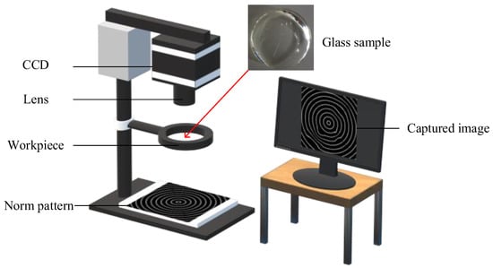 The adopted test samples are 6.0 mm thick and 48.4 mm in diameter and are arbitrarily drawn from the production line of a multifocal glass producer. In order to capture digital imaging images of norm patterns by testing samples to create imaging deformation maps of samples, this work suggests an imaging acquisition device using a concentric circular pattern for imaging image extraction. Figure 4 illustrates the arrangement of the image acquisition apparatus to capture the test images of multifocal glasses. The test sample is inserted horizontally into the custom-made fixture in front of the norm pattern. A norm pattern of essentially concentric circles is placed on the foundation of the stand. A camera with a mount is applied to capture images from the sight transferred through the test glass on a pattern of concentric circles. To capture a digital image of a norm pattern with appropriate brightness, the light source control of the surroundings in which the image is acquired is also important.