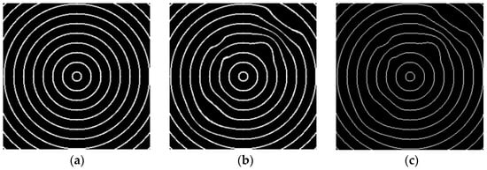 Figure 5a,b shows two images captured from transmission imaging of the concentric circular pattern through a normal multifocal glass and a defective glass, respectively. The flawed image has noticeable deformation in the upper right area. The acquired images are preprocessed in a number of stages to enhance the clarity of the appearance of objects on light-transmitting glasses. In order to quantify the degree of deformation of the acquired pattern images, Figure 5c depicts the binarized and thinned images of defect samples by applying the Otsu method [28] and thinning algorithm [29] to perform segmentation and thinning operations sequentially when using a concentric circular pattern. With these two methods, most concentric circles are separated from the background and thinned to become binary and 1-pixel width images. The results show that moderately deformed defects on transparent glass surfaces are correctly segmented in binary images, regardless of small differences in deformation.