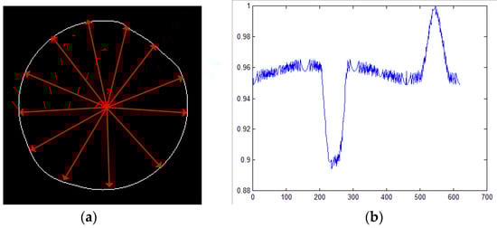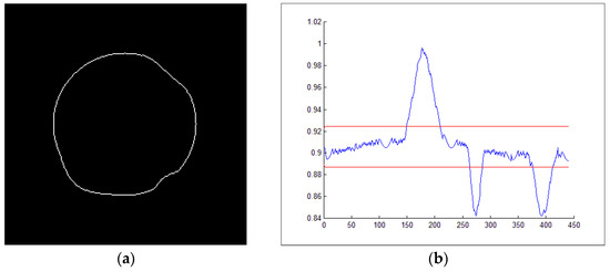 The parameter designs of the chart are the multiple of the standard deviation applied in the control limits (L) and the value of constant weight . The capability of the EWMA scheme is roughly comparable to that of the CUSUM scheme, and in some respects, it is simpler to establish the model and manipulate the schema [35,36]. Figure 7a is the output of the fifth circle in the concentric circular pattern of a test image performed by the EWMA scheme. Figure 7b shows when EWMA is used to detect the deformation defect regions; the boundary point range of the defect position will thus be clearer.