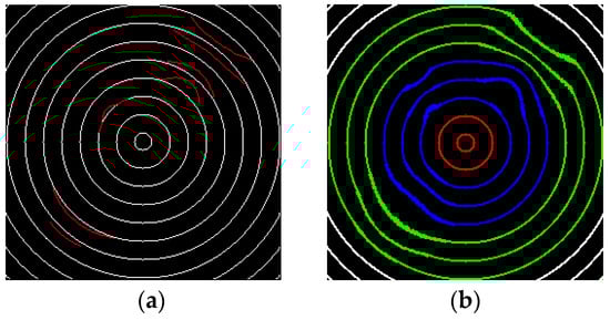 When calculating the distances of centroid radii from the u-th circle to the circle’s centroid and normalizing it to a vector , all points and Euclidean distances from the feature vector can be plotted, as shown in Figure 6a. Figure 6b indicates that the more the normalized distance values are, the farther they are from the center position, and the potential deformation in these concentric circle regions is more obvious.