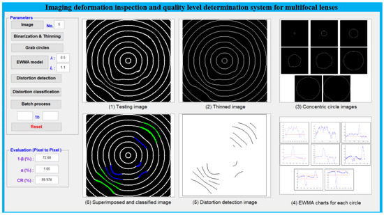To confirm the capabilities of the proposed approach using concentric circular patterns, the performances of these recommended techniques are assessed on 550 sample images (350 training images and 200 test images) with different degrees of deformation. Each captured image has a size of 256 × 256 pixels, and each pixel contains 8 bits of gray scale. The algorithm of the realized deformation defect detection system is edited on the MATLAB application software platform, and implemented on the MATLAB R2013 version on the desktop (INTEL CORE i5-8250U 1.60 GHz, 32 GB RAM). Figure 10 shows the user interface design of the developed deformation defect detection system, showing all the processing steps using the concentric circular pattern in the multifocal glass.