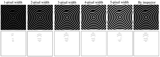 The size in pixel units of the line thickness of each circle on the concentric standard patterns influences the detection efficiency of the suggested approach for deformation defects. Smaller deformation defects will be more completely identified if an appropriate line thickness pixel size is chosen in the concentric standard pattern. We use a computer program to generate standard concentric patterns with different line thicknesses and then use these standard patterns with different line widths together with test samples to capture test images. We examine concentric circular patterns with line widths from 1 to 6 pixels in concentric circles by the suggested approach. Figure 11 shows the images acquired by the suggested method, employing patterns of concentric circles with line widths of five kinds of pixel sizes and the results of a defect sample. We find that concentric circles with a thickness of one pixel are less sensitive to the detection of deformation defects, resulting in the lowest recall rate. On the other hand, concentric circles with a greater pixel thickness are more sensitized to the detection of deformation defects and lead to more false positive alarms. Table 3 denotes that the detection outcomes of the concentric circular patterns with line widths of 2 pixels and 3 pixels are more appropriate, with a higher recall rate and a lower false positive rate and a better deformation detection performance.