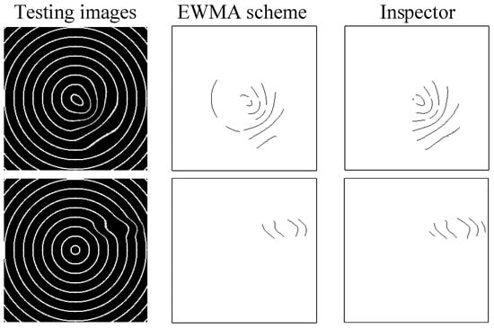 The distance feature vectors of all complete concentric circles in a test image are contrasted with those of the defect-free image, and the distance deviations of the respective edge points are measured to locate potential deformations in the test image. To detect slight deviations in distance variations, we propose a slight deviation control scheme, the exponentially weighted moving average (EWMA) scheme, which is usually applied in statistical process control [31,32]. We apply the EWMA scheme to find slight changes in distance deviations to detect deformation defects.