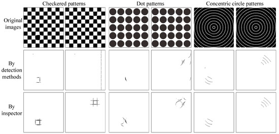 Using the method based on the Hough transform [22], two conventional norm patterns, a checkered pattern, and a dot pattern, were applied to detect deformations to differentiate the results of deformation defect detection. Because we adopt the three norm patterns to create consistent deformation defect images by choosing the same deformed locations and deformation degrees, the deformation distinctions among the three norm patterns can be contrasted more precisely. To show the impact of deformation detection on the consistent deformation images, Figure 13 shows some detection results of the Hough transform-based method, proposed method, and inspector for deformation defects using a checkered pattern, a dot pattern, and a concentric circular pattern, respectively. The Hough transform-based method with the checkered pattern makes many wrong identifications not only in missing alarms but also in false positives, and the same method with the dot pattern also results in some wrong identifications in missing alarms and false positives on the deformation defect inspection of multifocal glasses. The suggested approach with the concentric circular pattern can check most of the deformation defects and make less false identifications. Table 5 sums up the results of the imaging deformation inspection by the Hough transform-based methods and the suggested approach using the three standard modes. This demonstrates that the suggested approach with the concentric circular pattern outperforms the current techniques using the checker pattern and dot pattern in the deformation defect detection of multifocal glass images.