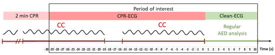 The period of interest in OHCA interventions was defined after at least 2 min of CPR, starting from 30 s before to 10 s after the begin of the regular AED analysis at 0 s, as illustrated in Figure 1. The period of interest is further denoted as the time interval (−30 s; 10 s]. Thus, the reference moment at 0 s splits two sequential ECG buffers within the period of interest: