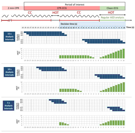 Strategy for continuous ECG analysis during CPR with 26 decision times [−15 s; 10 s] in the period of interest by sliding analysis intervals with durations of 15 s, 10 s, and 5 s (blue horizontal bars). Trend of computed sliding HOT (sHOT) over the 26 decision times (green vertical bars). CC: chest compressions; HOT: hands-off time; CPR-ECG: ECG during CPR; Clean-ECG: ECG during regular AED analysis.