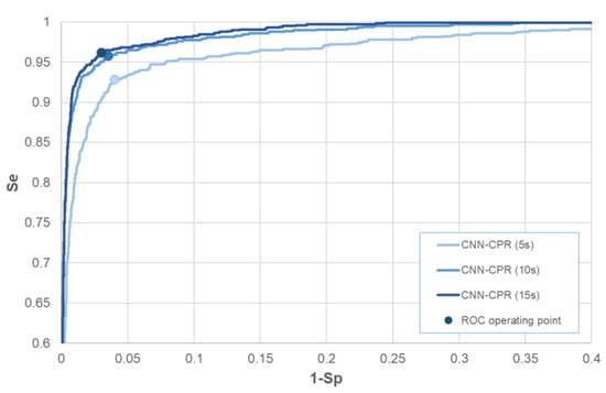 At the end of training and selection of the minimum loss models CNN-CPR (5 s), CNN-CPR (10 s), and CNN-CPR (15 s), they were subjected to receiver operating characteristic (ROC) curve analysis with the validation database (Figure 4). The area under the ROC curve (ROC-AUC) was estimated to be 0.9813, 0.9921, and 0.9938, respectively. The main result of this analysis is the choice of the ROC operating point, i.e., the determination of the threshold applied to the output pSh (Equation (1)) that provides optimal ROC performance in the validation database. The optimization strategy applied to the ROC curve was maximization of the sum Se + Sp→max, which was shown to be trustworthy in previous studies with binary shock advisory decision [35,41]. The chosen operating points for the three models are highlighted in Figure 4.