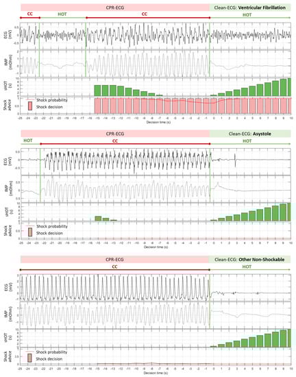 The six examples in Figure 5 and Figure 6 illustrate the principle of 1 s sliding ECG analysis during CPR with 26 decision times in the interval [−15 s; 10 s]. Different scenarios for CC-contaminated ECG rhythms (VF, ASYS, and ONR) were visualized by ECG and the additional impedance variation signal (IMP). The IMP signal was not included in the analysis but used only for the purpose of better illustration of the CC deflections and their interruptions during insufflations or regular AED analysis. The resulting sHOT and shock advice computed for each decision time of the model CNN-CPR (10 s) are shown in separate bar plots.