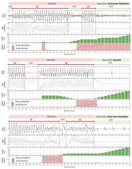 The correctly detected NSh rhythms, i.e., ASYS (Figure 5, middle) and ONR (Figure 5, bottom), showed almost zero pSh for all 26 decision times. These examples demonstrate the robust performance of the model CNN-CPR (10 s) for long continuous CC episodes (sHOT = 0 s), as well partially interrupted CC episodes (sHOT > 0 s). Nevertheless, analyses during sHOT = 0 s presented the most challenging conditions for rhythm detection, as illustrated in the two examples with erroneous Sh detection: (i) ASYS [−5 s; 0 s] in Figure 6 (middle); (ii) ONR [−15 s; −10 s] in Figure 6 (bottom). Just a little over 1 s of clean ECG (sHOT > 1 s) improved specificity by sharply reducing pSh to zero.