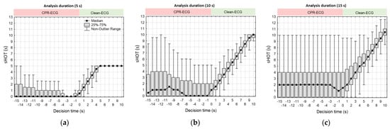 Statistical box plots of sHOT distribution over decision time estimated for the test OHCA database and analysis durations of 5 s (a), 10 s (b), and 15 s (c). The analysis interval covers a buffer with anteriority to the decision time [−15 s; 10 s], sliding in steps of 1 s.