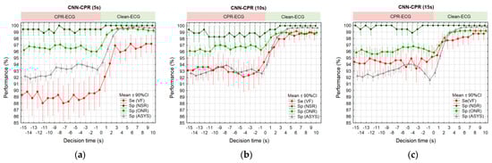 This study also compared three CNN-CPR models with different analysis durations (5 s, 10 s, and 15 s). The training process in Figure 4 based on the validation ROC curves showed substantial improvement in CNN-CPR performance from 5 s to 10 s, while the difference between 10 s and 15 s was negligible. The detailed analysis of the test performance over time in Figure 8 shows that model CNN-CPR (5 s) had a limited Se (VF) of 88–90% (CPR-ECG) and 96–97.2% (Clean-ECG). Favorably, Se (VF) improved to 92–95% (CPR-ECG) and 97.5–99% (Clean-ECG) for both longer analysis durations of 10 s and 15 s. From Figure 8, we can deduce that the specificities for all studied analysis durations (5 s, 10 s, and 15 s) were comparable in both parts of the period of interest, i.e., CPR-ECG (91.5–94% ASYS, 95.5–97% ONR, and 98.2–100% NSR) and Clean-ECG (99–99.8% ASYS, 99–99.5% ONR, and 100% NSR), identified in the plateau of maximum performance with decision times from 3 s to 10 s.