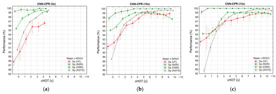Investigating the concept for sliding rhythm analysis during CPR, it is relevant to study all sequential analysis decisions together. Therefore, we defined a common decision set of all analyses in the period of interest, including 26 sliding analyses with four performance metrics per analysis (Se (VF), Sp (ASYS), Sp (ONR), and Sp (NSR)), which were described over time in Figure 7. This common decision set was studied in groups quantified by sHOT, thus identifying the subset with continuous CC (sHOT = 0 s) or other subsets partially or fully interrupted with CC (sHOT > 0 s). The performance results in 12 sHOT intervals (0 s, (0–1 s], …, (9–10 s], >10 s) are shown in Figure 9 (mean value ± 90% CI) and Table 2 (mean value) for the three CNN-CPR models with analysis durations of 5 s, 10 s, and 15 s. All models presented the lowest performance during continuous CC (sHOT = 0 s), which monotonically improved as sHOT increased in the analysis interval (sHOT > 0 s). Limitations have been noted for some models due to their inability to satisfy the AHA performance goals [47] for some rhythms during continuous CC, i.e., model CNN-CPR (5 s) with Se (VF) = 87.8%, Sp (ASYS) = 90.6%; CNN-CPR (10 s) with Sp (NSR) = 97.8%; CNN-CPR (15 s) with Sp (ONR) = 94.2%, Sp (ASYS) = 85.7%. An important result that can be read from Figure 8 and Table 2 is the minimal sHOT interval, which benefited rhythm analysis to achieve the following performance above the AHA goals: