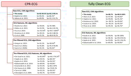 Comparison with state-of-the-art algorithms for analysis of CPR-ECG and fully Clean-ECG signals. This study reports (bolded font) the test performance for CNN-CPR (10 s) as the min–max range for Se (VF), Sp (NSR, ONR, and ASYS) with results taken at decision time in the range [−15 s; 0 s] for CPR-ECG, and decision time equal to 10 s for fully Clean-ECG. Other studies are included only if they reported performance for OHCA databases, cited as found in the original articles: Se (VF) and Sp (min–max range reported for rhythms NSR, ONR, and ASYS, where available). Sp * relates to specificity values that are applied to a mixed dataset (ONR, ASYS, and/or NSR) in published studies. Se, Sp & denotes studies which used an indefinite rhythm category that was neither true positive nor true negative in the context of a binary shock advisory decision. The studies referred in the figure are as follows: Hajeb et al., 2021 [38], Jekova et al., 2021 [35], Kwok et al., 2022 [46], Didon et al., 2021 [31], Hu et al., 2019 [29], Krasteva et al., 2010 [22], Li et al., 2008 [27], Gong et al., 2023 [52], Isasi et al., 2020a [36], Isasi et al., 2020b [37], De Graaf et al., 2021 [30], Hajeb et al., 2021 [25], Ayala et al., 2014 [14], Babaeizadeh et al., 2014 [17], Aramendi et al., 2012 [16], De Gauna et al., 2008 [24], Tan et al., 2008 [20], Eilevstjønn et al., 2004 [51], Shen et al., 2023 [49], Krasteva et al., 2020 [41], Irusta et al., 2019 [53], Picon et al., 2019 [54], Ayala et al., 2015 [39]. CNN: convolutional neural network; ML: machine learning.