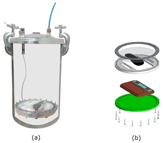 The novel calibration setup that we propose is visualized: (a) cross-section of the pressure tank, enabling visualization of the support holding the insole during the calibration phase; (b) CAD image of the parts composing the support, safely housing the insole and its electronics.