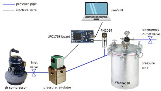 Outside of the tank, a standard LPC1768 electronic board is used to control the behaviour and set the reference for the pressure regulator via customized firmware, which allows the user to interact in real-time with the system through a laptop. A voltage amplifier circuit is implemented to scale the output of the board (0–3 V) up to the expected command signal range for the pressure regulator (0–10 V). Conversely, a voltage divider performs the opposite voltage conversion, enabling the pressure sensor to be read directly from the same board.