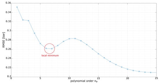 Calibration of the base instantaneous polynomial, showing the RMSE on the validation dataset as a function of the order of the polynomial. A very large range of values for is examined; however, from the plot it is evident that a local minimum can be found at . Therefore, a restricted yet meaningful range for the polynomial orders (up to ) is considered in the second step of the calibration.