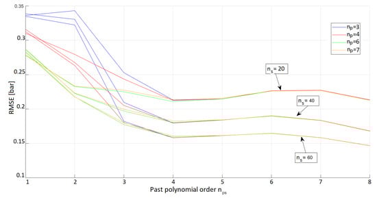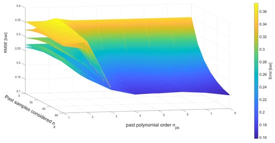 The problem as formulated in (15) is solved for , and (and all the possible combinations of these). The same training and validation sets described previously were used. The metric to compare the different models was again the RMSE of the estimated pressure of each model against the pressure recorded in the validation dataset. An overview of the results of this broad optimization is shown in Figure 4, where it is apparent that a more complex model gives generally better results. In particular, the larger the number of past samples considered, the more accurate the pressure estimate becomes. The same is true for an increasing value of .