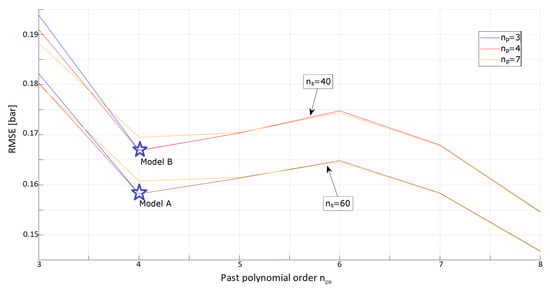 Analysis of the best results achieved. Of the different models represented here, two are selected by virtue of their accuracy and reduced complexity, and indicated with a star-shape on the graph. Model A represents the best trade-off in the validation scenarios considered, since it achieves a smaller RMSE when compared to other models which are still easily treatable (i.e., where . Model B retains good performances (as well as the property of being locally optimal given the number of past samples considered) and is more reactive to dynamic variations of the pressure signal as it considers a reduced range of the dynamic history of the sensor’s state.
