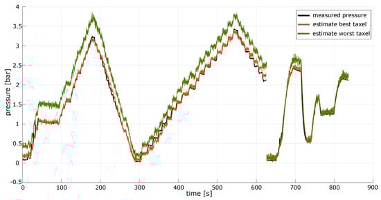 The two optimal models presented above have very interesting parallels with the results of a previous investigation reported in [] (concerned with the same insoles), where a pure polynomial of order three was selected and employed to model the taxel’s behaviour. In this sense, the increased flexibility of our model, that also considers past states of the taxel, results in a much more accurate estimation for the pressure value acting on the taxels themselves at each time instant (see Table 1). To report these results, the instantaneous model proposed in [] was calibrated and validated again, using the same datasets considered in our identification procedure. Including the past state successfully confirmed our initial claims and improved the pressure estimates delivered by the model by halving the overall RMSE on the validation dataset considered (the RMSE was reduced from almost 9% to about 4.4% of the pressure range considered). Notably, the results obtained were not only more precise, but were also obtained much more quickly owing to the different formulation of the optimization problem, as pointed out in Section 4.3. Thus, the presented method not only has a stronger physical base, but uses an optimization which is much faster to set up and solve. In comparison to the algorithm suggested in [] our algorithm proved to be 100 times faster (∼3 s against 260 s, on a portable Intel i7-11 laptop with 16 Gb RAM). To conclude, we show in Figure 7 the pressure estimates achieved by one of the proposed models (Model A) on the validation dataset considered. The curves corresponding to the pressure estimates of two different taxels are shown, namely the taxel associated with the lowest and highest RMSE. Although the more accurate estimation is clearly an improvement, the other model is capable of reconstructing the input pressure quite well.
