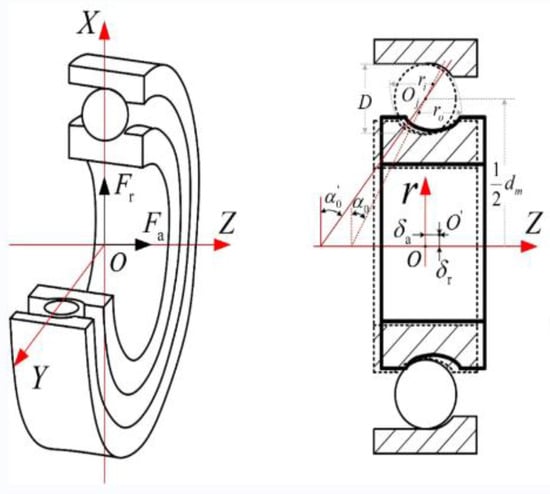 According to the theory of elastic wall thickness ring [], the radial clearance variation of the ball bearing and the initial contact angle of the rolling bearing can be obtained.