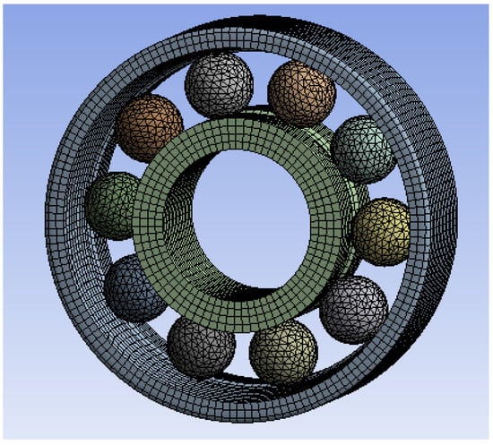 The rolling element is divided by tetrahedral mesh, and the inner and outer races are divided by hexahedral mesh. The surface of the inner and outer races and the shaft is divided by mapping surface to make the mesh more uniform and obtain more accurate results. The finite element model meshing generates a total of 105,225 elements and 370,509 nodes. The mesh quality is 0.9, and the overall meshing is shown in Figure 4.