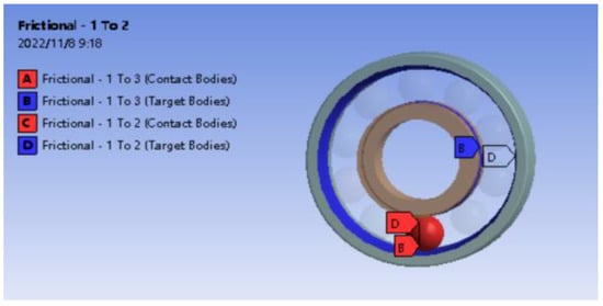 Contact pairs need to be established when surface-to-surface contact occurs in multi-body parts. The bearing has 10 rolling elements. Each rolling element needs to set contact pairs with inner and outer races. A total of 20 pairs of contacts have been established. The contact between the rolling element and the inner and outer races is friction contact. According to the contact setting, when the concave surface contacts with the convex surface, the convex surface is specified as the contact surface, and the concave surface is the target surface, so the inner and outer raceway surfaces are set as the target surface, and the rolling element surface is the contact surface. The contact friction coefficient is set to 0.15 []. The contact between a rolling element and the raceway is shown in Figure 5.