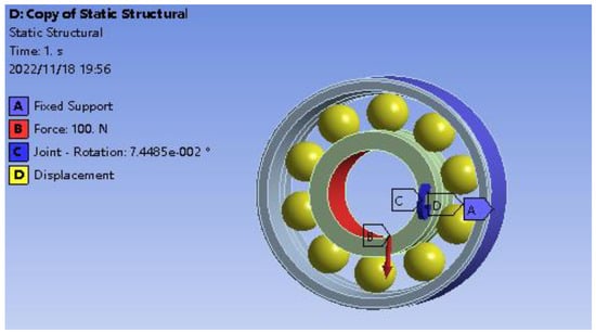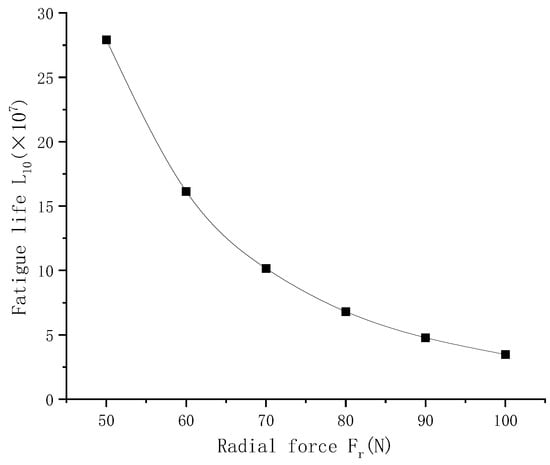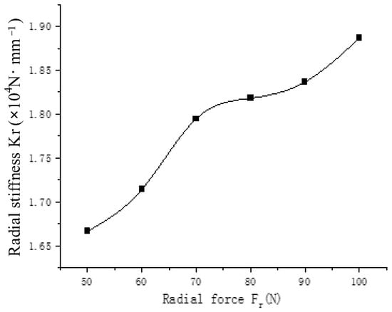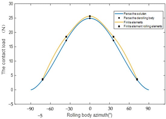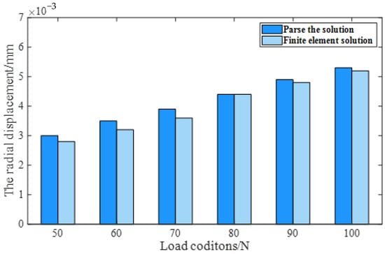 Since the radial stiffness and fatigue life of the mechanical model and the finite element model are obtained by substituting the calculated values of the ball contact load and the radial displacement of the bearing into Equations (7)–(12), the ball contact load and the radial displacement of the bearing are used to verify the finite element model.