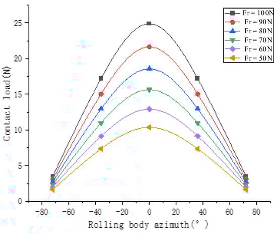 Figure 9 shows, from bottom to top, the contact load diagram of the angular contact ball bearing, which is subjected to a radial force of 50 N, 60 N, 70 N, 80 N, 90 N and 100 N. It can be concluded that the contact load of the angular contact ball bearing increases with the increase in radial load. The radial stiffness of the angular contact ball bearing increases with the increase in radial force in Figure 10. The life of the angular contact ball bearing is shown in Figure 11. The fatigue life of the angular contact ball bearing decreases with the increase in radial force, and the decreasing speed is slower and slower. The contact load between the roller and the inner raceway of the angular contact ball bearing under condition 6 is shown in Figure 12.