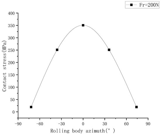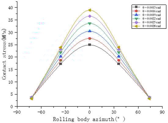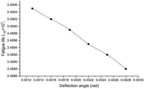 Hybrid loading conditions are considered to analyze the mechanical properties and fatigue life of bearings. The contact load between the rollers and the inner raceway at different deflection angles (0.0013 rad, 0.0016 rad, 0.0019 rad, 0.0022 rad, 0.0025 rad and 0.0028 rad, from top to bottom) under a radial load of 200 N is shown in Figure 13. The stress change slope increases with the increase in the deflection angle. The variation of the angular contact ball bearing life with the preload angle is shown in Figure 14. As the deflection angle increases, the bearing life decreases.