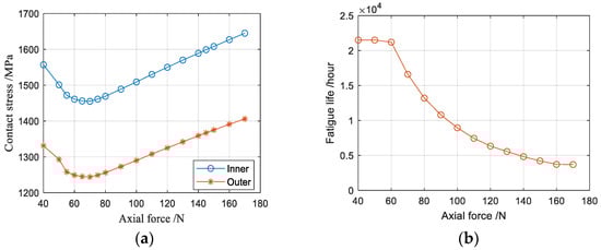 Under different preloads, the clearance changes accordingly, which changes the contact angle, stress and bearing life. Setting the radial load at 150 N, the calculation results of the clearance change, contact state and fatigue life of the bearing under different axial force conditions are shown in Table 4. The curves of the maximum contact stress between the rolling elements and the inner race with different axial forces listed in Table 4 are shown in Figure 15a. When the axial force is 70 N, the lowest contact stress value appears. At this time, the corresponding bearing installation preload is 30 N. As shown in Figure 15b, the life value calculated via quasi-statics has no extremum, and the change of fatigue life cannot be used to judge the optimal preload.