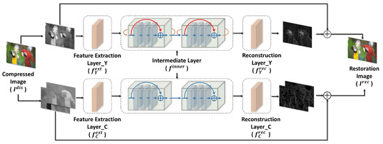 The architecture of deep learning-based restoration methods are commonly made up of three layers: feature extraction, feature processing, and reconstruction. To realize the reconstruction layer, two approaches based on the output of the predicted content can be used: by predicting the whole restored image [6,9,10,11,13,14] or by predicting the residual information for compensating the artifacts [5,7,12,15,16,17,19,20]. Because the amount of information required to predict residual information is less, the residual information prediction is less difficult and the accuracy can be improved. Therefore, our approach adopts the residual-based restoration. We proposed our restoration method based on DnCNN [15]. The architecture of our designed model, shown in Figure 2, predicts the residual image of all YCbCr channels between the compressed and original images. The model can be roughly segmented into three parts: the feature extraction layer, which includes and , the intermediate layer , and the reconstruction layer, which includes and . The operation in the whole model can be expressed as Equations (1) and (2):