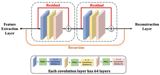 However, the recursive network could easily cause the problem of gradient vanishing. To address this issue, we integrate our method with the concept of a residual block [22,26] in our intermediate layer. We decompose our six-layer convolutions in our recursive network into two residual block units in a series connection, as shown in Figure 3. It is worth noting that the PReLU location in our design has been swapped with the convolutional layer, which embraces the same concept of the pre-activation design proposed by ResNet-v2 [27] to effectively improve the performance of residual blocks.