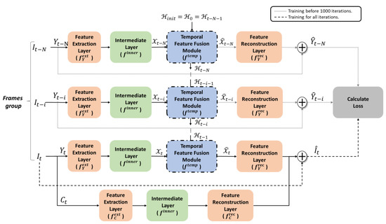 There is no need to adjust parameters significantly during the training because the pre-trained model has the ability to remove compressed artifacts, so that we set the initial learning rate to 0.01. After the 50,000th and 100,000th iterations, the learning rate was adjusted to 0.001 and 0.0001, respectively, and the model training was completed after updating all model parameters 150,000 times. We use Equation (7) as the objective function for the first 1000 iterations of training, which requires reconstructing frames in a frame group as shown in Figure 4. To speed up the training, after 1000 iterations, the objective function in Equation (4) is applied to the model, which only measures for the current frame instead of frames to save the complexity. is set as 0.25 in our objective functions.