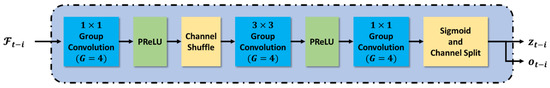 The detailed structure of temporal feature fusion module is shown in Figure 5. We designed the based on the ConvGRU [24,33] concept, and its structure is referred to the ShuffleNet [34] concept to avoid the computational complexity and parameter increase caused by a large number of channels. As shown in Figure 5, the 128 channel features of are first evenly divided into four groups of channel features, and each group is processed by a group convolutional layer with a size of 1 × 1, and then shuffled via ShuffleNet to process different channels of feature information. Next, it is processed sequentially by the group convolutional layers with sizes of 3 × 3 and 1 × 1. That is, we used three group convolutional layers in total to fuse the and . Finally, the sigmoid function is applied to the output to clip it to [0, 1] as the probability of importance, and the output is divided into two gates, each with 64 channels: the update gate z and the output gate o. After the features acquired in time and space are fused, and can be reconstructed and updated using and by Equations (5) and (6), respectively, where denoted the Hadamard product. The residual information for restoring the compressed frame can be generated by a feature reconstruction layer after the new feature is calculated, and the hidden state is passed on to the next frame for processing and updating, as shown in Figure 4.