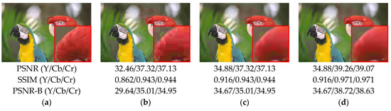 Table 4 compares the results of our method to those of other studies [10,12,13,14,15,16,17] tested in the LIVE1 dataset. Since no other existing work provides data for the chroma channel, we will only compare our chroma improvement to the chroma quality of JPEG-compressed images. Moreover, since the SSIM settings used in the studies conducted in [14,15,16] are not the same as those in other works, we only use PSNR and PSNR-B for comparison. The values in parentheses represent the percentage improvement of our proposed method compared to other methods.