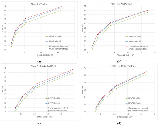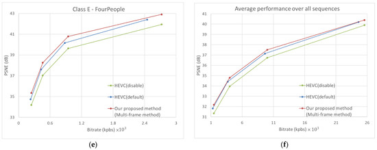 RD-curve results for difference sequence using QP = 22, 27, 32, and 37. (a) Class A—Traffic; (b) Class B—ParkScene; (c) Class C—BasketballDrill; (d) Class D—BasketballPass; (e) Class E—FourPeople; (f) average performance over all sequences.