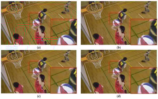 Although the blocking artifacts visible in the HEVC disabled in-loop filter are absent in the HEVC baseline results, temporal artifacts and color blocks are present. For example, there is a grain artifact in the ball in Figure 9c, a jerkiness artifact in the wall in Figure 10c, and mosquito noise in the horse in Figure 11c. Our method effectively removes all of the above types of artifacts caused by video compression, as shown in Figure 9d, Figure 10d, and Figure 11d.